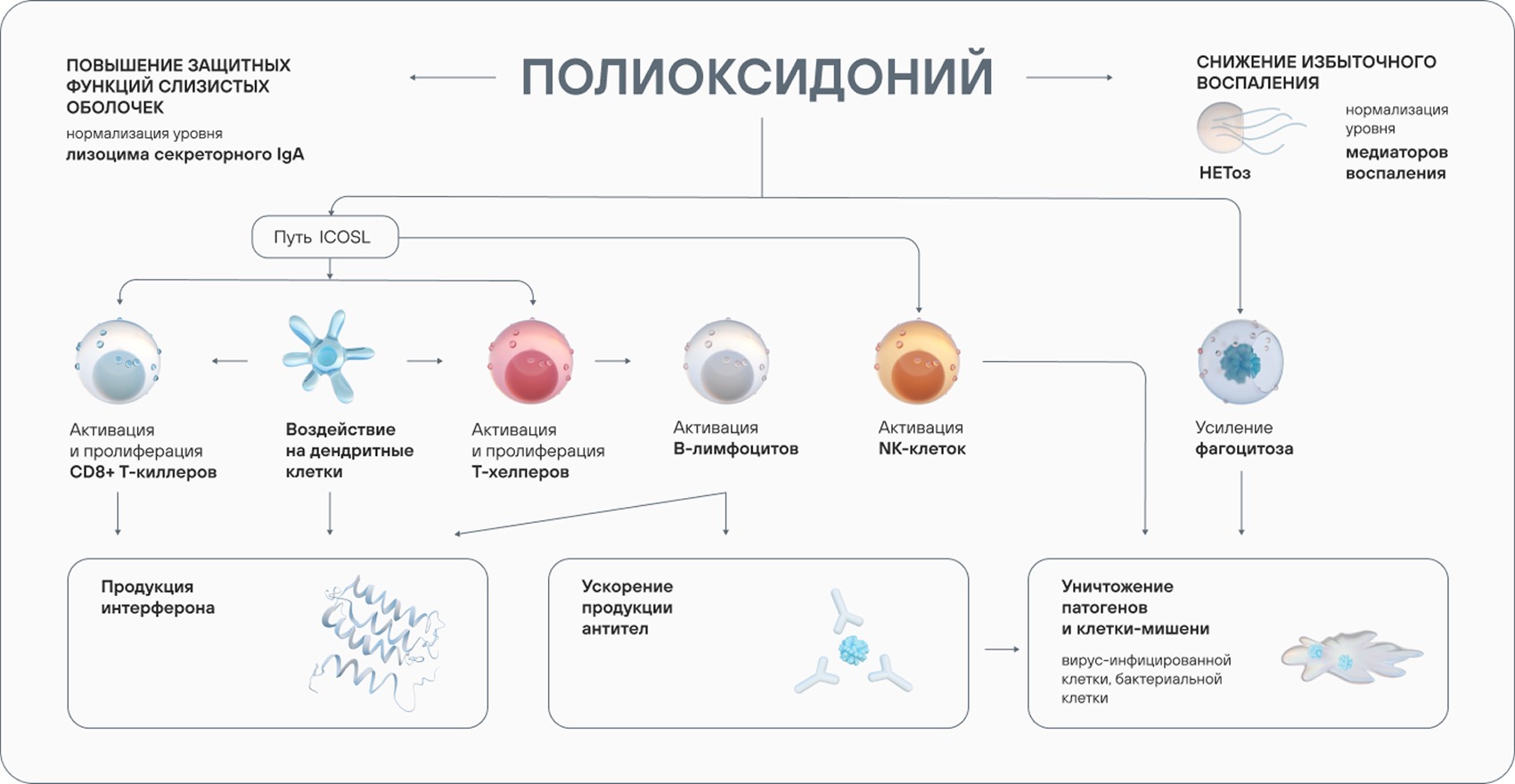 Также он обладает детоксицирующим, антиоксидантным и умеренным противовоспалительным свойствами. Действующее вещество Полиоксидония — азоксимера бромид.