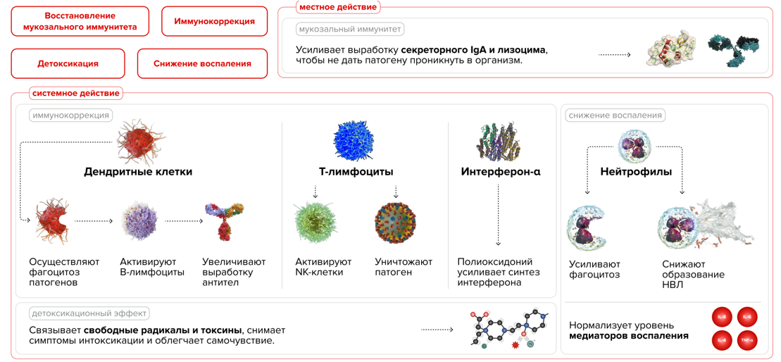 Также он обладает детоксицирующим, антиоксидантным и умеренным противовоспалительным свойствами. Действующее вещество Полиоксидония — азоксимера бромид.